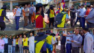 ཞྭ་མོ་ནག་པོའི་གོམ་བགྲོད་ལས་འགུལ་ཉིན་བདུན་པ་དེ་བཞིན་ཞོགས་པ་ཆུ་ཚོད་ ༥:༠༠ ཐོག་ནས་དབུ་འཛུགས་ཀྱིས་༧སྐུའོ་གཅུང་པོ་མངའ་རིས་རིན་པོ་ཆེ་བསྟན་འཛིན་ཆོས་རྒྱལ་མཆོག་དགོངས་པ་རྫོགས་ནས་ཞག་ཞེ་དགུ་འཁེལ་ཡོད་སྟབས། ལས་འགུལ་བ་རྣམས་ནས་དམ་པ་དེ་ཉིད་ཀྱི་ཆེད་དུ་མ་ཎི་དང་སྨོན་ལམ་གསུང་འདོན་ཞུས་ཡོད་པ་དང་། དེ་གྲུབ་རྗེས་གོ་སྒྲིག་ཚོགས་ཆུང་གིས་དེ་ཉིན་གྱི་གོམ་བགྲོད་ལས་རིམ་ངོ་སྤྲོད་ཞུས་རྗེས་རིམ་བཞིན་གོམ་བགྲོད་ཀྱིས་སུན་ཌར་ནཱ་གྷའི་ཕྱོགས་སུ་གོམ་བགྲོད་ཞུས། དེ་རིང་གནམ་གཤིས་ཅུང་ཚ་དྲོད་སྙོམ་པས་ལས་འགུལ་བ་རྣམས་ལ་དཀའ་ཁག་ཆེ་བ་ཅང་མ་བྱུང་། དེ་ལྟར་ཕྱི་དྲོའི་ཆུ་ཚོད་ ༡༢:༣༠ ཙམ་ལ་ང་ཚོ་སུན་ཌར་ནཱ་གྷར་འབྱོར་སྐབས་དེ་གའི་གླ་གཏོང་རླངས་འཁོར་མཐུན་ཚོགས་ཀྱི་ཚོགས་མི་དང་། རླངས་འཁོར་ཆུང་ངུ་གཏོང་མཁན་གྱི་ཚོགས་མི། ས་གནས་ཀྱི་ཚོང་པ་དང་མི་མང་བཅས་ནས་གོམ་བགྲོད་ལས་འགུལ་བ་རྣམས་ལ་མེ་ཏོག་གི་ཕྲེང་བ་དང་། མེ་ཏོག་གི་འདབ་མ་གཏོར་ནས་བསུ་བ་ཟབ་རྒྱས་གནང་བྱུང་བ་དང་། དེ་བཞིན་ཀྲྀ་ཤི་ནཱ་ཆན་ཌ་དང་། ཌུར་གཱ་ཌུཏ་ (པཱ་ལུ་ཤར་མཱ་) ཊཱ་རཱ་ཆན་ཌ། བཱ་ལཱ་ཀ་རཱམ་ (ཊེཀ་ཆན་ཌ་) བཅས་ཀྱི་འགོ་ཁྲིད་འོག་ས་གནས་ཀྱི་མི་མང་ཚོས་བོད་ཀྱི་གཞོན་ནུ་ལྷན་ཚོགས་ཀྱི་ཞྭ་མོ་ནག་པོའི་གོམ་བགྲོད་ལས་འགུལ་དང་བོད་དོན་འཐབ་རྩོད་ལ་རྒྱབ་སྐྱོར་ཤུགས་ཆེའི་རྣམ་པའི་ཐོག་ནས་མཉམ་འཛོམས་གནང་བ་མ་ཟད། གོམ་བགྲོད་པ་ཚོའི་ལྷག་བསམ་དང་སྙིང་སྟོབས་ལ་བསྔགས་བརྗོད་ཀྱང་ཆེན་པོ་གནང་བྱུང་།
